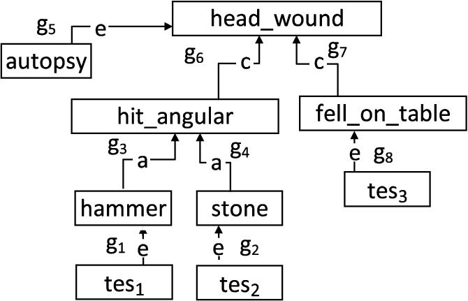As we described in previous work [39], principles from the literature on reasoning about evidence state that inference is often performed using domain-specific generalisations [2,4,6], also called defaults [25,32], which capture knowledge about the world in conditional form. A distinction can be made between causal generalisations (e.g. ‘fire typically causes smoke’) and evidential generalisations (e.g. ‘smoke is evidence for fire’) [4,25]. In the current paper, we also consider generalisations that are neither causal nor evidential; examples are abstractions [4,12] and mere statistical correlations. Inference can be performed in a deductive or forward fashion, where from a generalisation (e.g. ‘fire typically causes smoke’) and its antecedent (fire), the consequent (smoke) is strictly or defeasibly inferred, and in an abductive [12,17] or backward fashion, where from a causal generalisation or an abstraction and by affirming the consequent (smoke), the antecedent (fire) is defeasibly inferred. Note that the term ‘deduction’ is not consistently used in the literature, as it can either mean strict inference, in which the consequent universally holds given the antecedents (e.g. [20]) or defeasible inference, in which the consequent tentatively holds given the antecedents (e.g. [33]). To cover both meanings, in this paper ‘deduction’ is used as an umbrella term for both defeasible ‘forward’ inference and strict ‘forward’ inference.