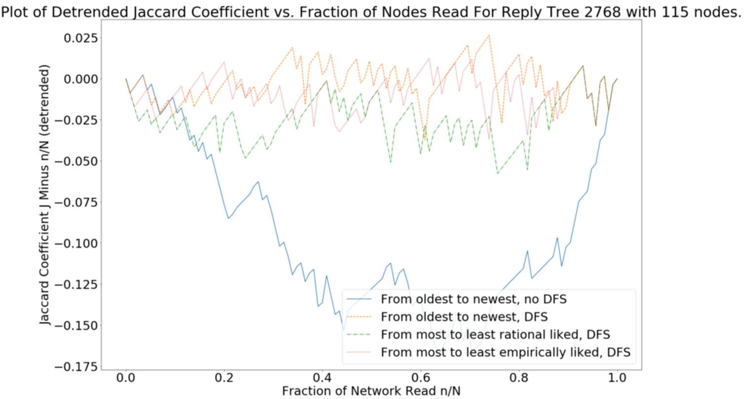 Finally, we seek to answer the question of why should sorting by likes be better than sorting by time. We hypothesise that likes is somehow related to how “good” a point that comment is making, which by standards of civil discourse raises its probability of winning and force of argument. Future work will make these notions precise.