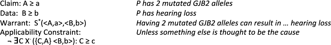 Rather than refer to domain content, the argument schemes were formulated at a higher level of abstraction in terms of qualitative network node variables and relations. For example, to paraphrase one of GenIE’s Effect to Cause schemes shown in Fig. 1, the claim that a node A in the KB was at or above a certain threshold is supported by the Data (premise) that a node B in the KB is at or above a certain threshold, and by the Warrant (premise) that there is a positive influence relation from A to B. Such a scheme could be used to generate an argument that a certain patient has a genotype of two mutated alleles of a GJB2 gene based on the data that he has hearing loss, and the warrant that this genotype can result in hearing loss. Note that, unlike the schemes in the Walton et al. catalogue [60], the GenIE schemes distinguished premises as Data or Warrant [57]. The Data premise represented patient-case-specific information (stored in nodes of the KB), while the Warrant represented general biomedical principles (represented as qualitative constraints in the KB). The Data/Warrant distinction played a role in the organization of the text (DPlan) and in decisions of the argument presenter. In the DPlan, the Warrant was represented as the satellite of an RST Background relation, whose nucleus was an RST Evidence relation; the satellite of the Evidence relation was the Data, and the nucleus was the Claim [17]. The argument presenter applied heuristics to the DPlan to make a letter more concise. One heuristic was if two adjacent arguments in the DPlan included the same warrant, the warrant in the second argument was replaced by an adverb such as ‘similarly’.