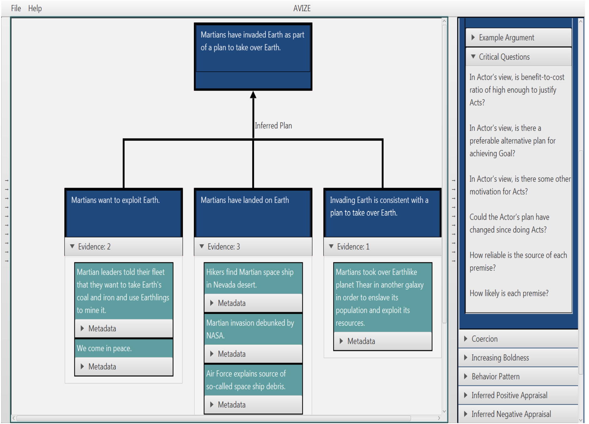 Challenges to arguments were represented in several ways in AVIZE. First, the user could attach both supporting and opposing pieces of data to the premise of an argument and decide which to credit. In this application, it was possible for sources to conflict and to have varying credibility. As shown in Fig. 10, for example, the premise that Martians have landed on Earth was supported by a news item that hikers had found a Martian space ship in the Nevada desert but challenged by two other items attached to that premise. Second, AVIZE enabled the user to attach counterarguments and provide answers to critical questions challenging a claim (Fig. 11). Also, Fig. 11 shows that users could color-code claims and premises to show their confidence in a premise or conclusion.