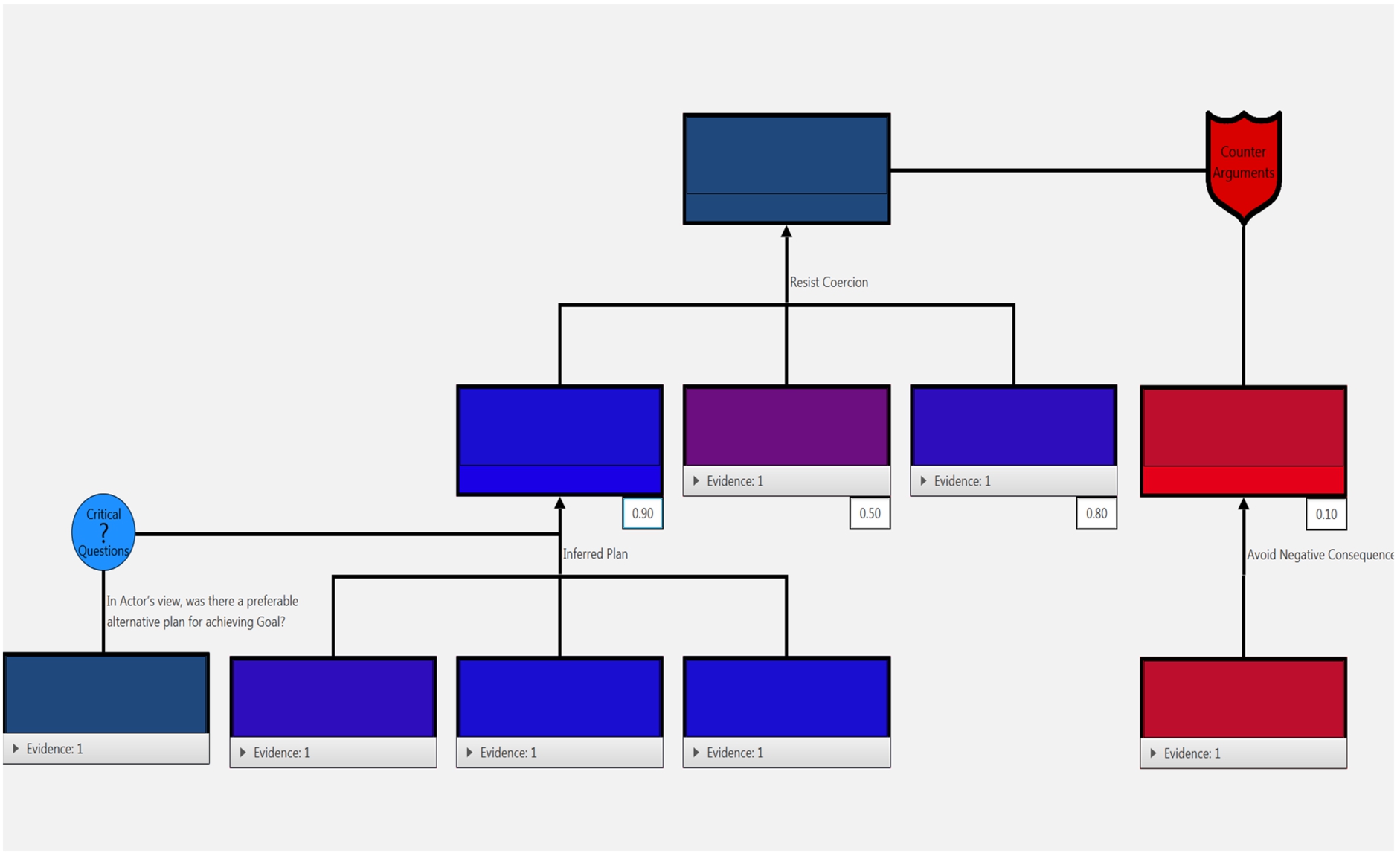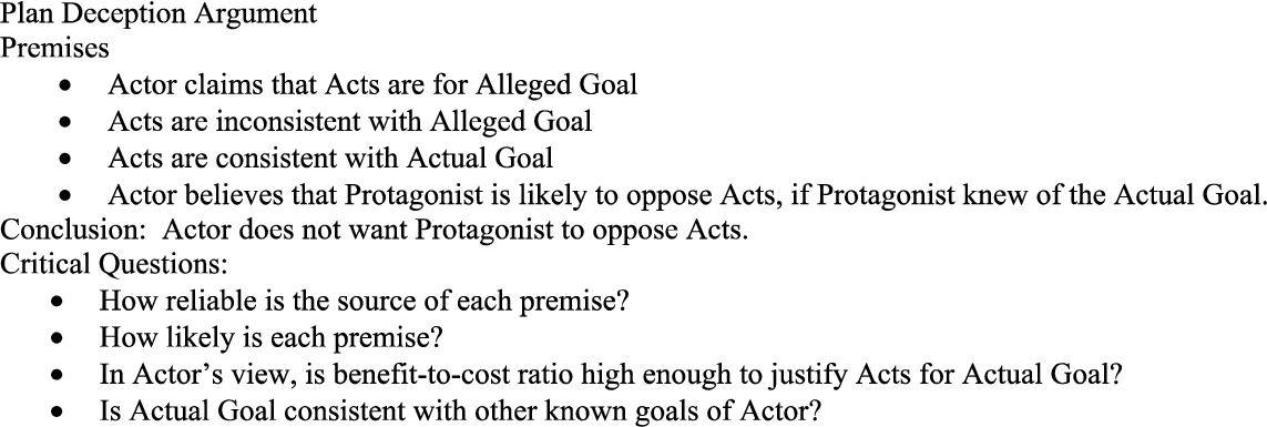 We identified the following other schemes used to argue about an Actor’s intentions: Plan Distraction, Inferred Plan, Coercion, Increasing Boldness, Behavior Pattern, Inferred Positive Appraisal, Inferred Negative Appraisal. Like the Plan Deception scheme, these schemes are domain-specific but are related to AI plan recognition heuristics. In addition, we identified the following schemes for arguing in favor of a planned action of the protagonist: Practical Reasoning, Resist Coercion, and Avoid Negative Consequences.16 A kind of summary can be provided by listing the names of the schemes that were used from beginning to end of the Weinberger [62] article: Plan Distraction, Coercion, critical question of Coercion, Resist Coercion, Plan Deception, Inferred Plan, Coercion, Increasing Boldness, Coercion, Inferred Plan, Inferred Plan, Resist Coercion, Practical Reasoning, Avoid Negative Consequences, Avoid Negative Consequences, Practical Reasoning.