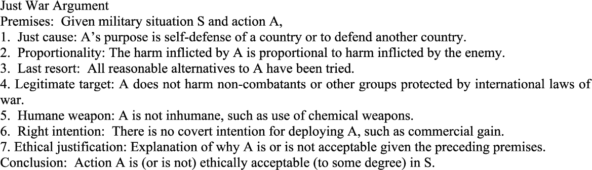 We defined an argument scheme (Fig. 12) which is more abstract than the specific military rules encoded in Arkin’s agents, yet which summarizes many of the key principles of international law and norms on just warfare [50]. To illustrate an application of this argument scheme to a fictitious case study, consider use of lethal force by Homelandia’s AI-controlled drone against a missile base in the country of Malevolentia that has been firing missiles across the border into Homelandia. The missiles have caused damage to several apartment buildings in Homelandia and killed several occupants. The Just cause premise is satisfied since the purpose of the action is defense of Homelandia. Suppose that all reasonable alternatives, such as proposing a cease fire to negotiate a truce, etc., have been exhausted, so the Last resort premise is satisfied as well. According to international norms, drone-fired missiles are not considered inhumane weapons, and Homelandia has no covert reason for attacking the Malevolentian missile base, respectively satisfying the Humane weapon and Right intention premises. However, suppose that it is not possible for Homelandia’s counterattack against the Malevolentian missile base to succeed without inflicting a very high number of civilian casualties since the missile base is located on the grounds of a hospital. In this case, the Proportionality and Legitimate target premises are not satisfied. Thus, there is conflicting support and opposition from the premises. In the Ethical justification, one may provide additional explanation as to why the action is ethically acceptable to some degree (or not).