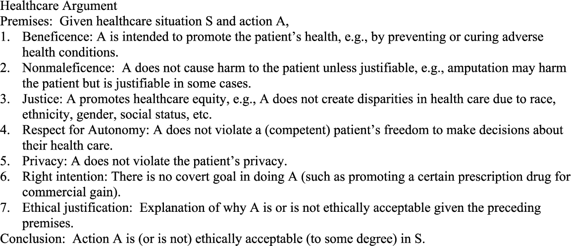 The field of biomedical ethics has provided ethical principles for the design of healthcare applications. Anderson and Anderson [2, 3] have done extensive research on design of explicit ethical agents in this domain. Adapting Ross’ prima facie duty approach to ethics [53], they implemented several duties of biomedical ethics [7]: beneficence (e.g. promoting a patient’s welfare), nonmaleficence (e.g. intentionally avoiding causing harm), justice (e.g. healthcare equity), and respect for the patient’s autonomy (e.g. freedom from interference by others). In addition to the above principles, the healthcare literature also cites the need to respect the patient’s privacy. Under the virtue of fidelity, Beauchamp and Childers [7] discuss the need for the professional to give priority to the patient’s interests, e.g. that the agent has no covert goal such as to endorse a particular medical device or prescription drug. The following Healthcare Argument scheme encodes these principles as premises (Fig. 13).