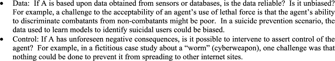 Figure 14 shows a number of critical questions for challenging the acceptability of an action A of an artificial ethical agent shared by the preceding schemes. (To save space, they are listed here rather than with each scheme.) The Data question is especially significant for explicit ethical agents that must rely in part on subsymbolic processing such as facial recognition.20 For many other data-related issues that could be used for critical questions, see [42].