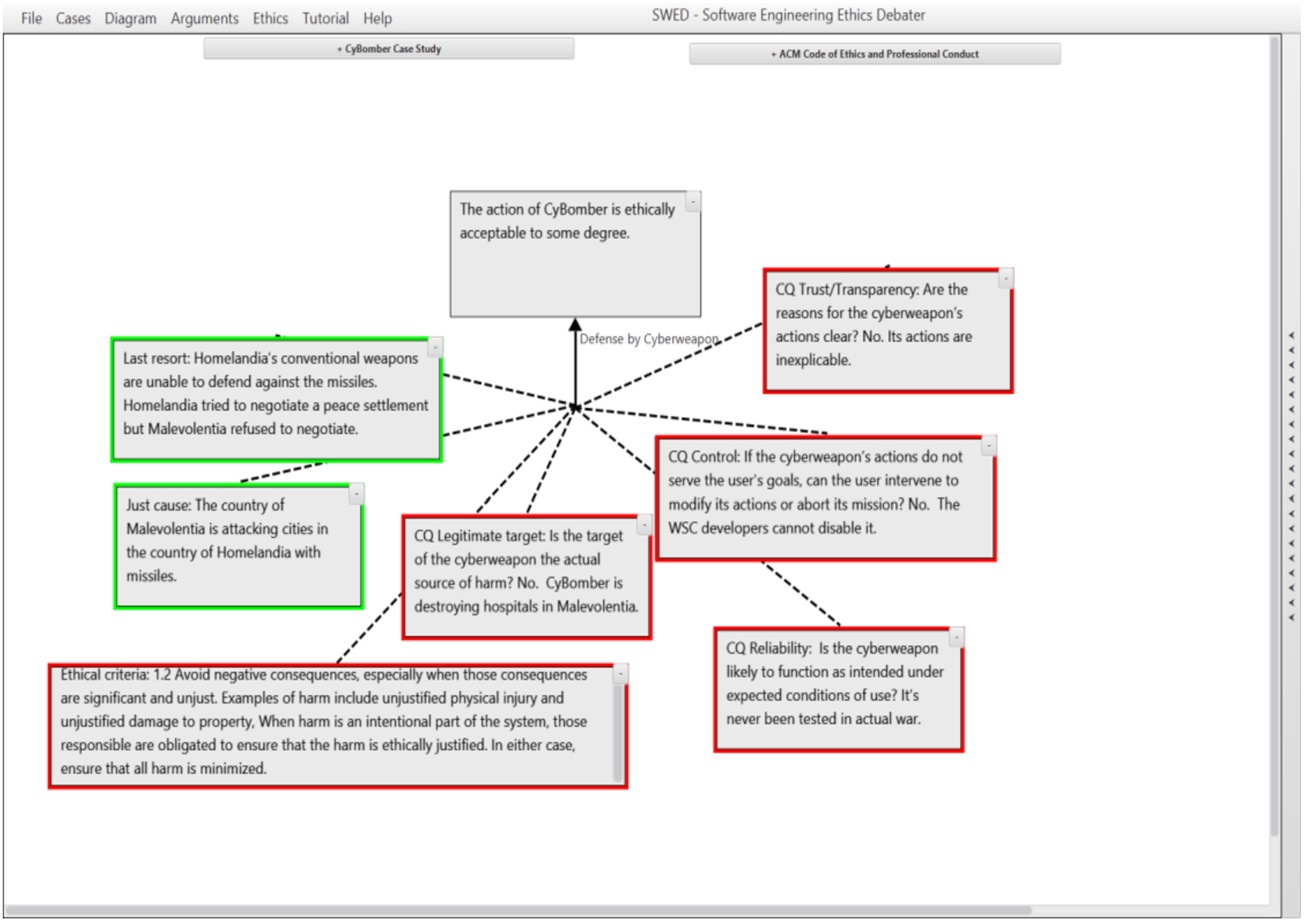 AIED (AI Ethics Debate) was designed to support creation and graphical realization of AI ethics arguments using argument schemes such as those described above as templates for constructing arguments. AIED provides the student with drop-down menus for selecting case studies and ethics materials, which when selected appear in windows on the screen. Argument scheme definitions are listed in a panel on the right-hand side of the screen. Course instructors may provide case studies and ethics materials of their choosing. If desired, they can author their own argument schemes too.21 A formative evaluation of AIED is described in [31]. The version of AIED used in the formative evaluation is freely available for non-commercial use from