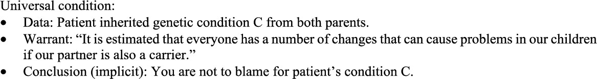 Looking back over our past projects, the main focus was on “naturally occurring” arguments witnessed in monological text, i.e., genetic counseling letters and information on genetic testing, and journal articles from the fields of genetics research, international relations, and environmental science policy.22 In the AIED project, rather than analyzing examples of “naturally occurring” arguments, we read analyses of case studies by ethics experts. The characterization of argument patterns in schemes resembles the characterization of discourse patterns in discourse plan operators (or “recipes”), e.g., for the interpretation and generation of certain conversational implicatures [30].