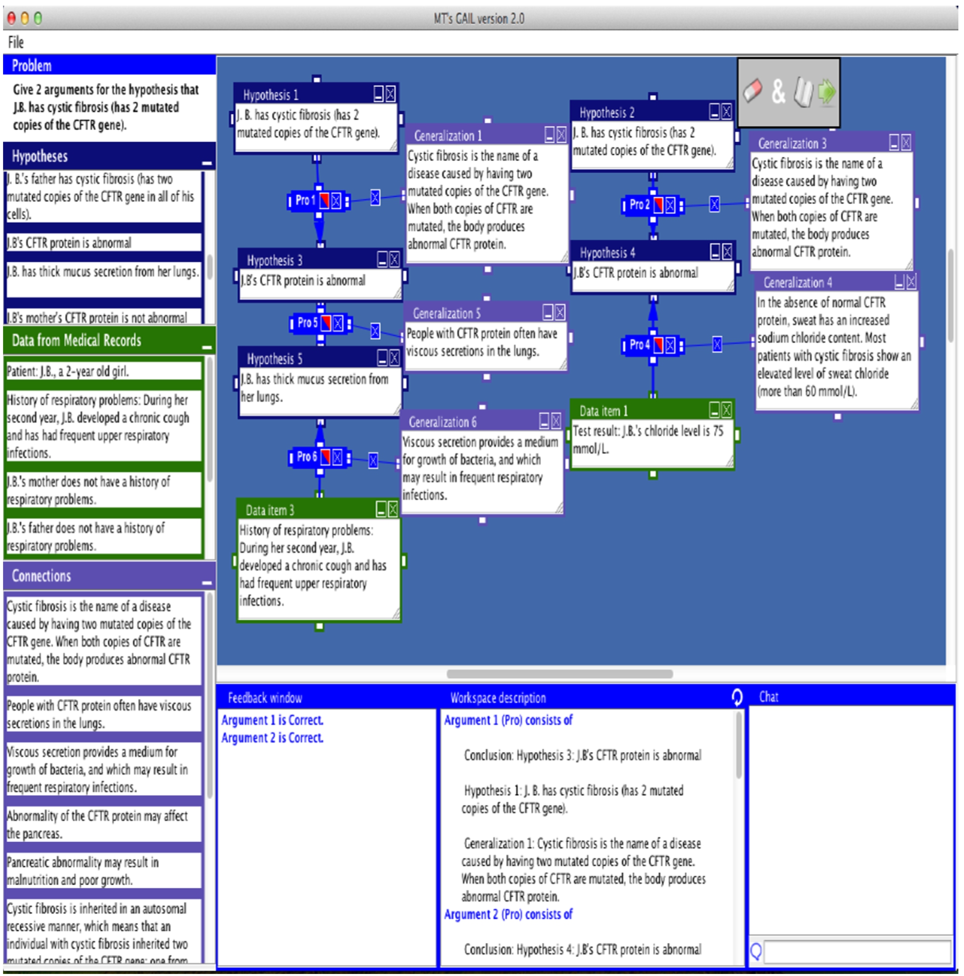 The argument generator and schemes developed for GenIE were repurposed as the core of an educational argument modeling system for biology students, GAIL [22, 34]. GAIL’s user interface presented the student with information to use in constructing graphical arguments: the Problem (to give an argument for a certain claim), the Data (information from a fictitious patient’s medical record), several possible Hypotheses, and Connections (possibly relevant principles of genetics, i.e. warrants). See a screenshot in Fig. 3. For example, a Problem was “Give two arguments for the hypothesis that the patient, J. B., has cystic fibrosis (has two mutated copies of the CFTR gene).” The Data about the patient included items such as “History of respiratory problems. During her second year, J.B. developed a chronic cough and has frequent upper respiratory infections”, and “J.B.’s mother does not have a history of respiratory infections”. The Connections included items such as “When both copies of CFTR are mutated, the body produces abnormal CFTR protein”, “Abnormality of the CFTR protein may affect the pancreas”, “People with CFTR protein often have viscous secretions in the lungs”, etc. To construct an argument, the learner could select appropriate items from the Data and Connections lists, drag them into the argument diagramming area, and connect them into a Toulmin-style (Claim-Data-Warrant) diagram of an argument (or chain of arguments as shown in Fig. 3).