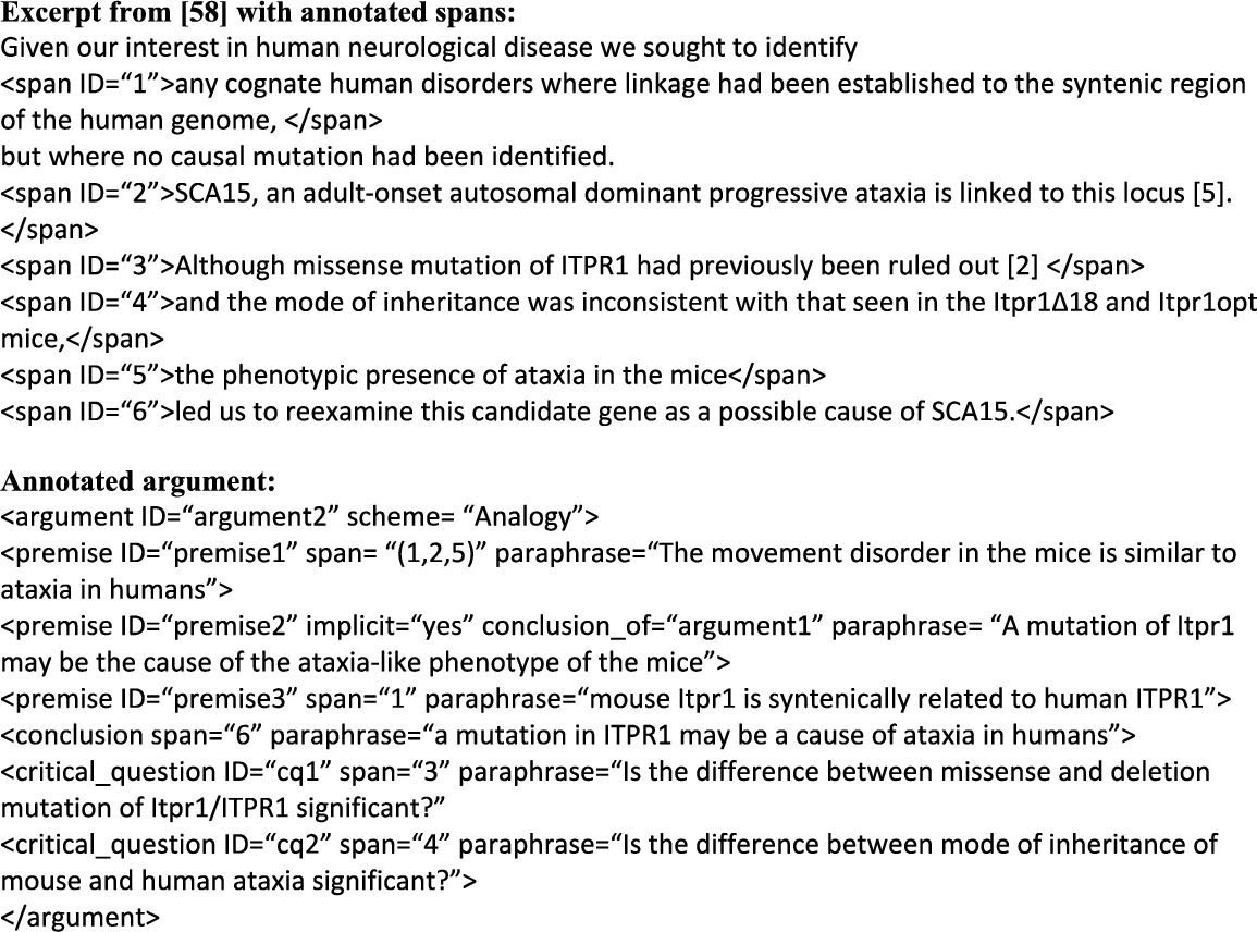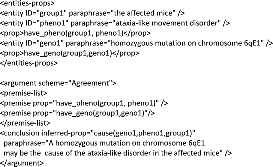 In [23] we suggested that in the future argument schemes might be acquired by inductive logic programming [48] from articles whose entities, relations, and arguments had been similarly annotated. We are currently experimenting with use of inductive logic programming to derive the argument schemes from the annotated article [27].