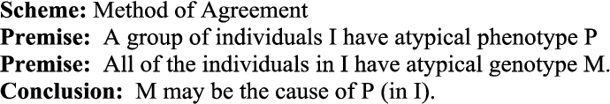 Note that the definitions of argument schemes in [21] did not refer to genetics concepts. However, given the results of the pilot study with undergraduates, we wanted to make the task easier for future annotators. Thus we redefined the argument schemes in terms of a small set of domain concepts such as genotype and phenotype, e.g. as shown in Fig. 5. The revised annotation guidelines10 Available at
