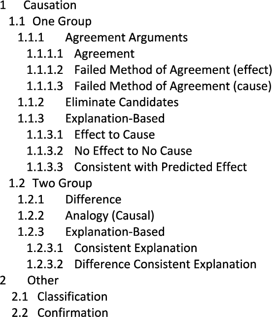 Another open issue is the taxonomic organization of and the “proper” level of specificity of argumentation schemes. For practical reasons, in some cases we provided human analysts and students with field-specific descriptions of schemes. For argument mining, we defined domain-specific schemes to make use of semantic information that could be provided by relation extraction tools. On the other hand, argumentation scholars (or cognitive scientists, perhaps) may wish to relate the definitions to more abstract descriptions of schemes. Also, by specifying schemes at a higher level of abstraction they may be more widely applicable, as was the case when our genetics schemes were adopted by other researchers for analysis of biochemistry research articles. Other open questions involve how best to organize the taxonomy: as a strict hierarchy or allowing a scheme to have more than one “parent”, and could schemes inherit critical questions from schemes higher in the taxonomy?