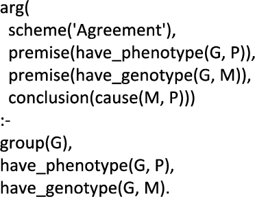 After revising the scheme definitions in terms of genetics concepts and relations,11 Unfortunately we never received extramural funding to support creation of an argument-annotated corpus of genetics research articles. Thus, we refocused on the argument mining research described in the rest of this section. Although the rule can be said to extract the arguments in the sense of finding arguments in a text, in another sense, it is generating arguments like the argument generator did in GenIE. This is different from the sense in which arguments are extracted by current machine learning approaches to argument mining. In fact, due to the flexibility of Prolog, the rules could be used to restrict the arguments that are returned by partially instantiating the rule, e.g., to find all arguments such that some genotype causes a certain phenotype.