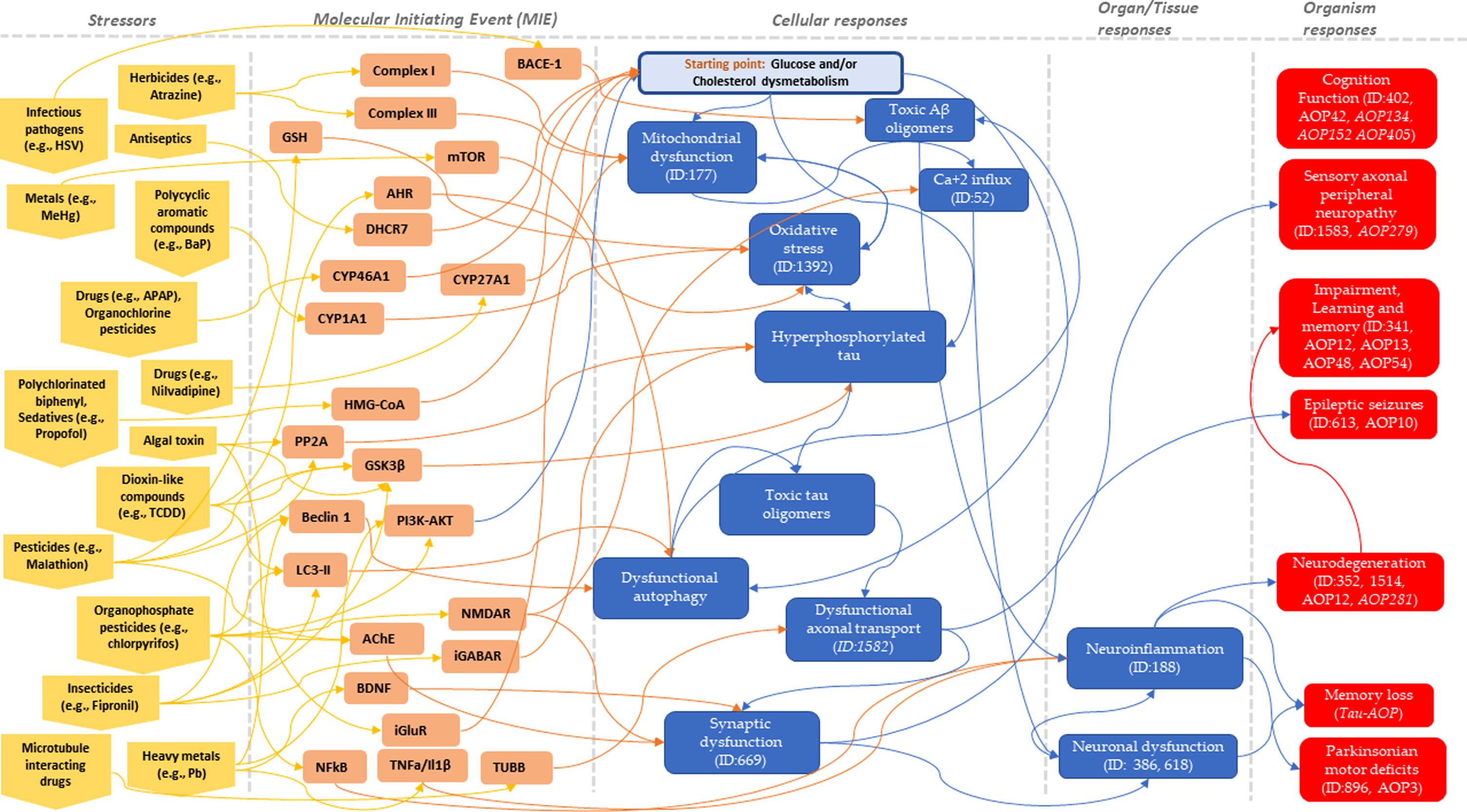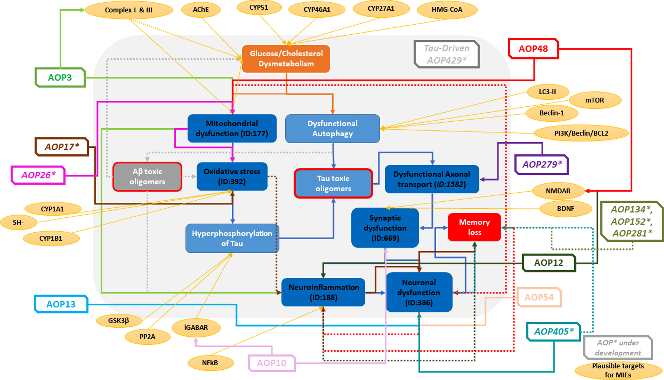 AOP48: Binding of agonists to ionotropic glutamate receptors in adult brain causes excitotoxicity that mediates neuronal cell death, contributing to learning and memory impairment. AOP3: Mitochondrial dysfunction and Neurotoxicity |