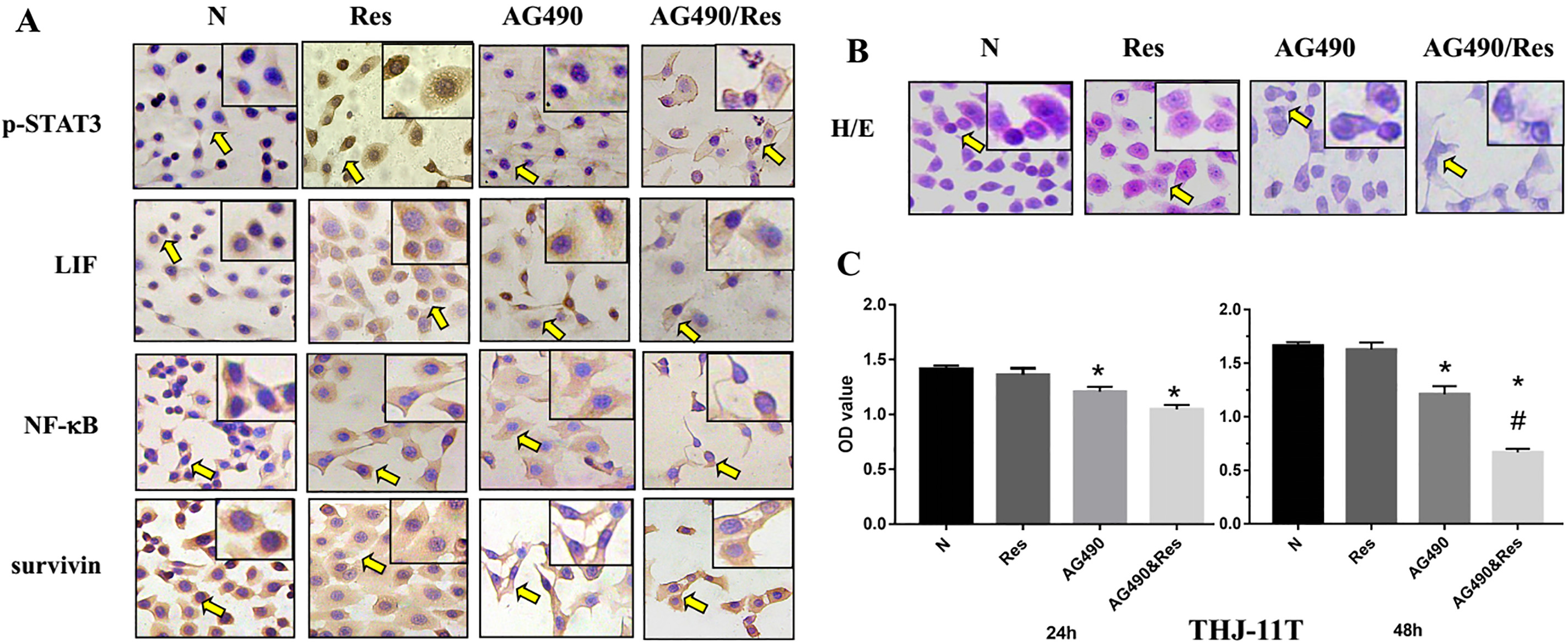 AG490 suppressed STAT3 activation and improved resveratrol sensitivity of THJ-11T cells. Immunocytochemical evaluation of p-STAT3, LIF, NF-B and survivin expression of THJ-11T cells cultured under normal condition (N), treated with 100 M resveratrol (Res), 80 M AG490 (AG490) and 100 M resveratrol and 80 M AG490 combination (Res&AG490) for 48 hours. Arrows indicate the portions shown in the insets with higher magnification (X 80). H/E morphological staining of THJ-11T cells. N, normally cultured cells; Res, 100 M resveratrol treated cells; AG490, 80 M AG490 treated cells; AG490&Res, 100 M resveratrol and 80 M AG490 treated cells. Arrows indicate the portions shown in the insets with higher magnification (X 80). MTT assay performed on THJ-11T cells under N, Res, AG490 and AG490&Res experimental conditions. , 0.01 in comparison with the Control and the Res groups; , 0.01 in comparison with the Control, the Res and the AG490 groups.