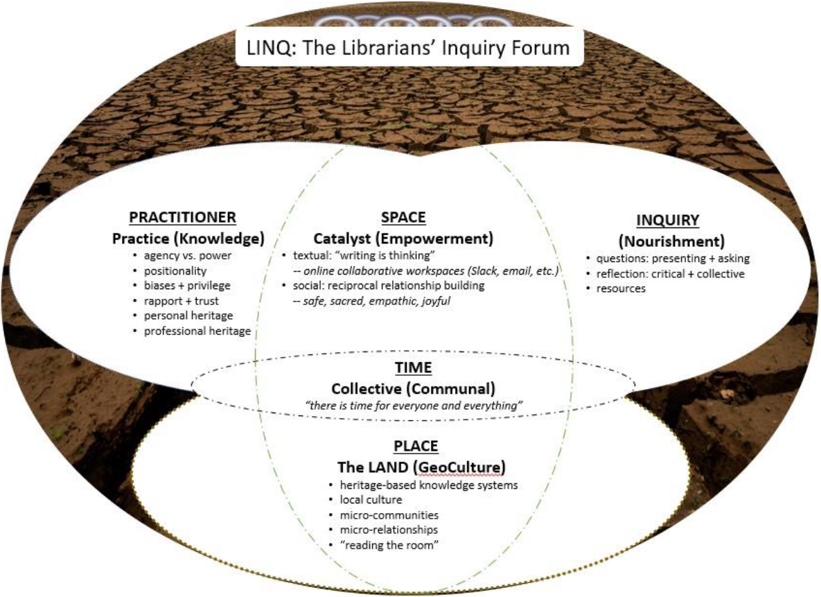 When considering the earlier inquiry groups, the truth about the land as foundational to reciprocal relationships, cultural progression, and social well-being was equally relevant. The geocultural context of where we do our work became a vital requisite for the LINQ design. With this delicate understanding of the importance of approaching inquiry-based engagement with mindful awareness of the terrain upon which we perform our lives, the LINQ model began to take form.
