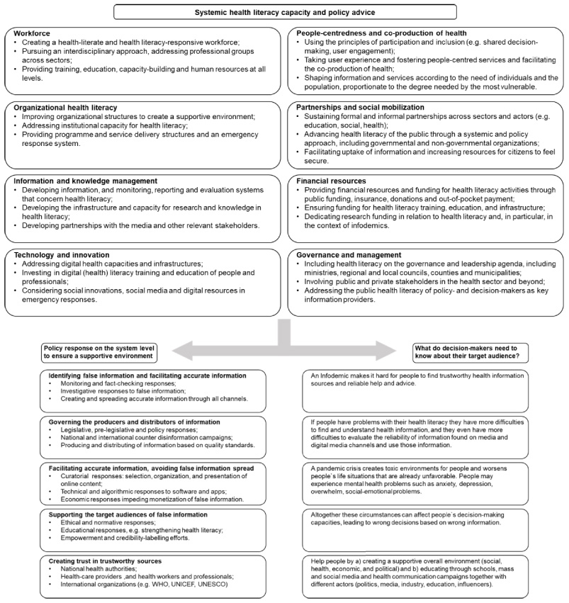 This paper addresses the critical role of health literacy during the COVID-19 infodemic and provides recommendations for decision-makers regarding how health literacy can be advanced as an empowering resource to mitigate the harmful effects of future infodemics. Based on a comprehensive literature review, key areas concerning health literacy are identified that help provide a strategic response during an infodemic. A framework for systemic health literacy capacity and policy advice is presented to inform and guide decision-makers on managing an infodemic with health literacy strategies. The way forward includes emphasizing the rights to access information and a broader view of how health literacy can help build back better in the aftermath of the COVID-19 pandemic. Finally, the paper includes a call to action for decision-makers to integrate systemic health literacy responsiveness into public health emergency strategies to counter a future infodemic’s diffusion.