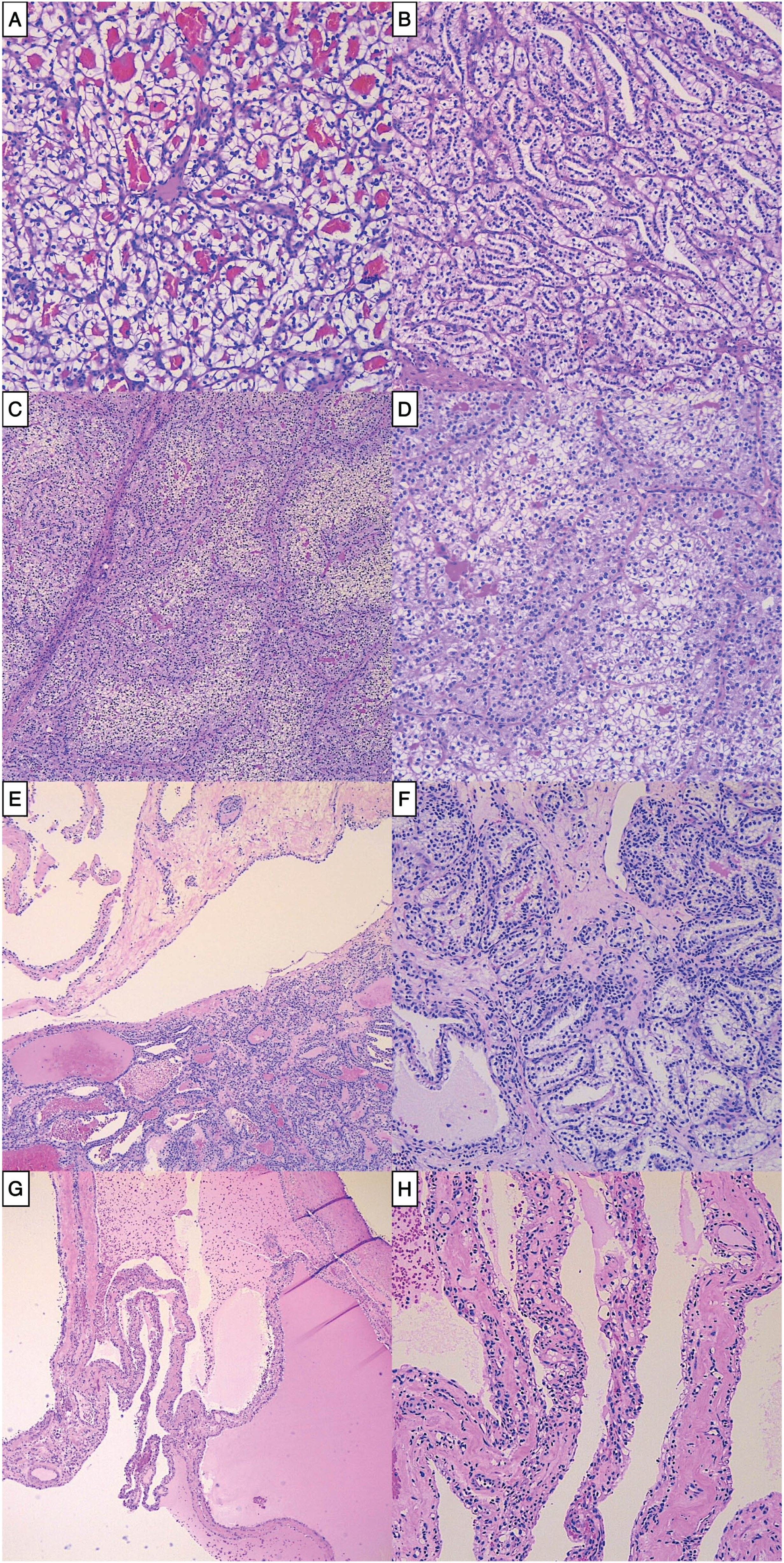 A. Characteristic CCRCC with nests of clear cells (100x); B. CCRCC showing nuclei lined up away from the basement membrane, mimicking CCTPRCT (100x). C. Low power image of TFE3 RCC displaying two-toned cytoplasm (40x). D. TFE3 RCC showing a mix of eosinophilic and clear cells with voluminous cytoplasm (100x). E. CCTPRCT with cystic and solid areas (40x). F. CCTPRCT showing tubules of low-grade clear cells with lined up nuclei away from the basement membrane (100x). G. MLCNLMP at low power (20x). H. MLCNLMP with single layers of bland clear cells lining septae (100x).