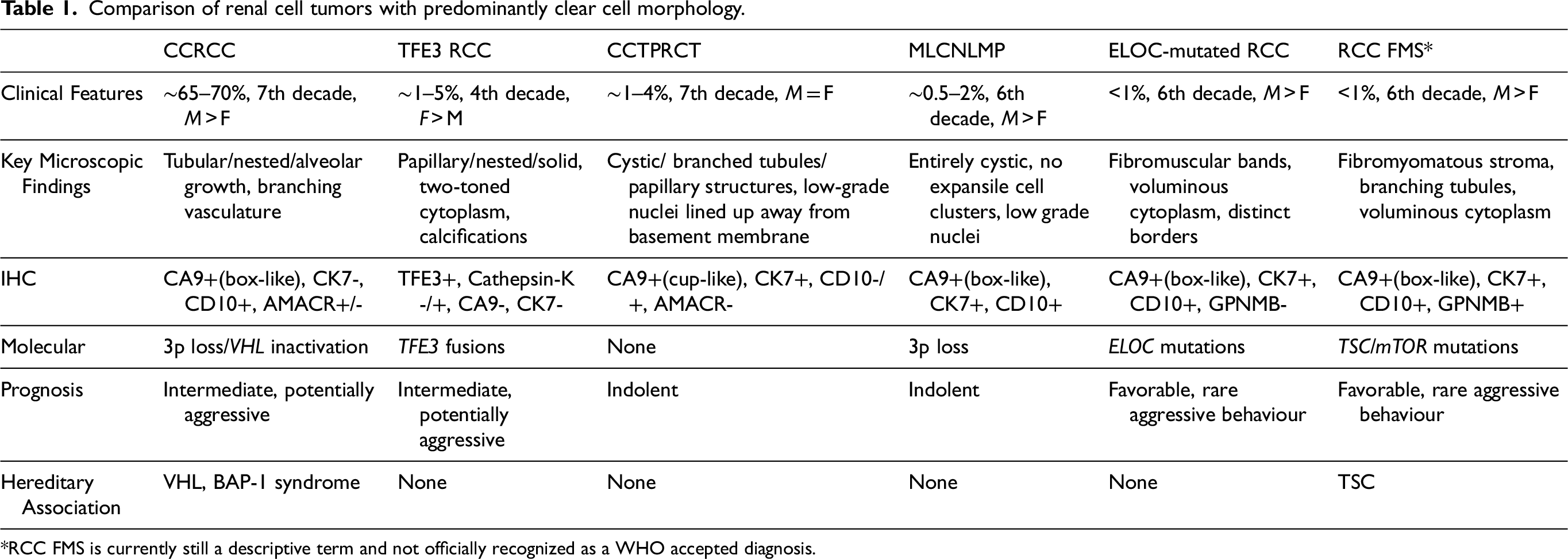 RCC FMS remains a descriptive term and is not yet an accepted WHO diagnosis. Therefore, RCC FMS can have overlapping morphologies with CCRCC, CCTPRCT, and