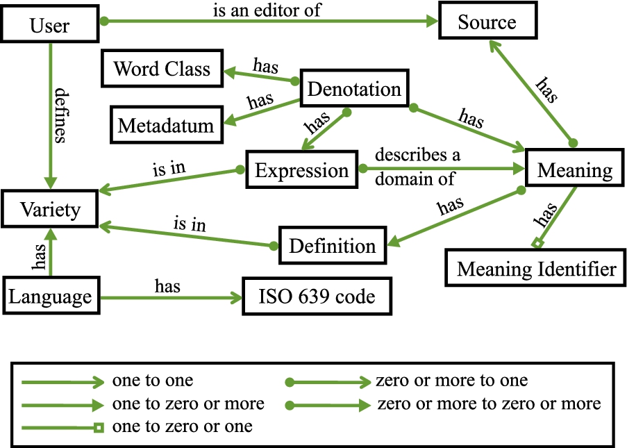 Meanings are entities assigned to expressions, thereby identifying expressions as translations or synonyms. For example, a source’s translation of the German expression “klingen” into English as “ring, sound, seem” can be interpreted as (1) the assignment of a single meaning to all four expressions or (2) the assignment of two or three meanings to “klingen” and of one of those to each of the English expressions. Meanings are source-specific. The identification and consolidation of equivalent meanings of distinct sources is a research topic, not a database feature. Meanings can have properties of three types. (1) Definitions are descriptions of a meaning, consisting of text strings annotated as being in particular language varieties. (2) Domains are expressions (e.g., “medicine”) that characterize a meaning, but do not express it. (3) Meaning identifiers are strings acting as references to identifiers in a source.