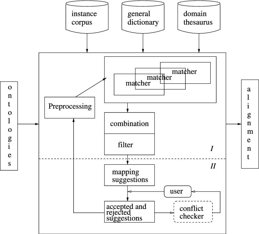 An alignment algorithm receives as input two source ontologies. Part I typically contains different components. A preprocessing component can be used to modify the original ontologies, e.g., to extract specific features of the concepts in the ontologies, or to partition the ontologies into mappable parts thereby reducing the search space for finding mapping suggestions. The algorithm can include several matchers that calculate similarities between the entities from the different source ontologies or mappable parts of the ontologies. They often implement strategies based on linguistic matching, structure-based strategies, constraint-based approaches, instance-based strategies, strategies that use auxiliary information or a combination of these. Each matcher utilizes knowledge from one or multiple sources. Mapping suggestions are then determined by combining and filtering the results generated by one or more matchers. Common combination strategies are the weighted-sum and the maximum-based strategies. The most common filtering strategy is the (single) threshold filtering. By using different preprocessing, matching, combining and filtering techniques, we obtain different alignment strategies. The result of part I is a set of mapping suggestions.3 Traditionally, in the OAEI it is this result (and thus part I) that is evaluated. In 2013, for the first time there was a track for evaluating interaction and thus also some issues related to part II.