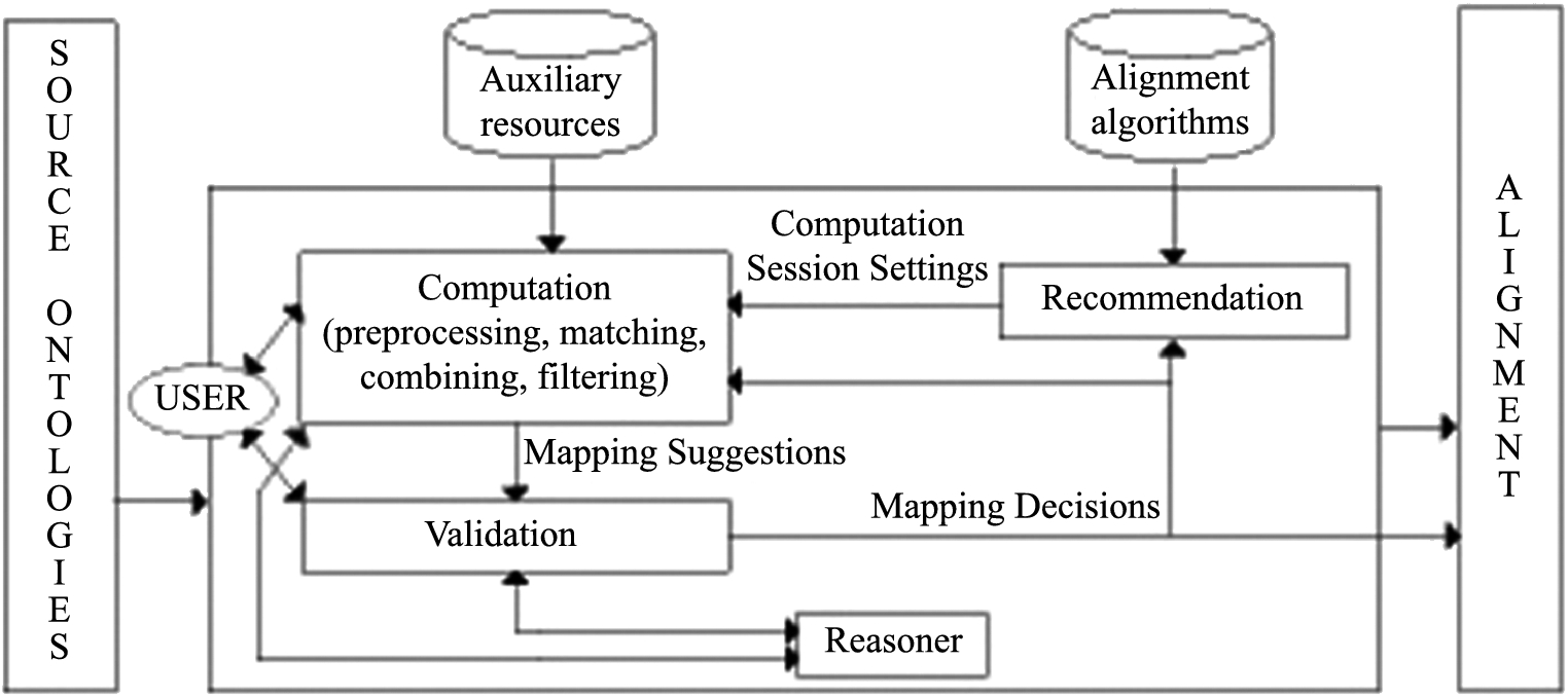 The framework covers different kinds of existing systems. For most tracks in the OAEI, participating systems usually compute an alignment using preprocessing, matching, combining and filtering algorithms. This is essentially a process in our framework where only one non-interrupted computation session is used and no validation nor recommendation sessions.