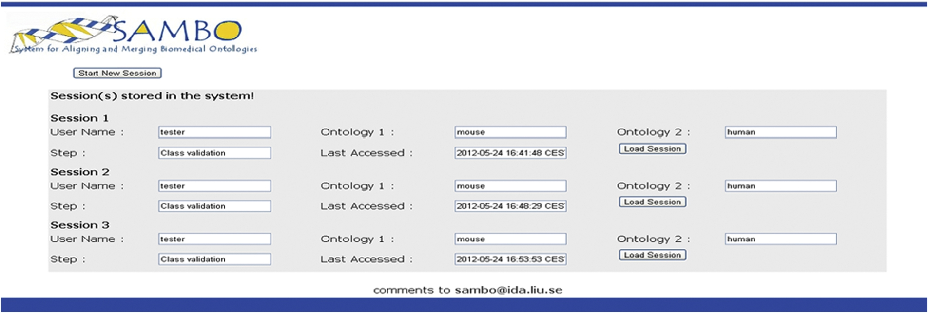 When starting an alignment process for the first time, the user starts a computation session. However, if the user has previously stored sessions, then a screen as in Fig. 5 is shown and the user can start a new session or resume a previous session. The information about sessions is stored in the session management database. This includes information about the user, the ontologies, the list of already validated mapping suggestions, the list of not yet validated mapping suggestions, and last access date. In the current implementation only validation sessions can be saved. When a computation session is interrupted, a new validation session is created and this can be stored. When a user ends or interrupts a session, the user can ask the system to, using the obtained validation decisions, filter the non-validated mapping suggestions, preprocess the data for a future session or compute a recommendation for the settings of a new computation session.