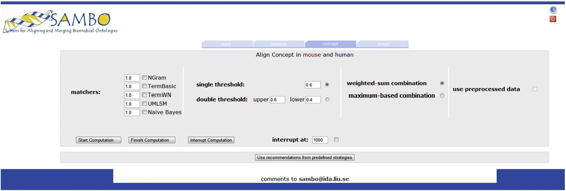 The session can be interrupted using the ‘Interrupt Computation’ button. The user may also specify beforehand a number of concept pairs to be processed and when this number is reached, the computation session is interrupted and validation can start. This setting is done using the ‘interrupt at’ field (Fig. 6). The output of the computation session is a set of mapping suggestions where the computation is based on the settings of the session. Additionally, similarity values are stored in the similarity values database that can be used in future computation sessions as well as in recommendation sessions. In case the user decides to interrupt a computation session, partial results are available, and the session may be resumed later on. The ‘Finish Computation’ button allows a user to finalize the alignment process. (A similar button is available in validation sessions.)