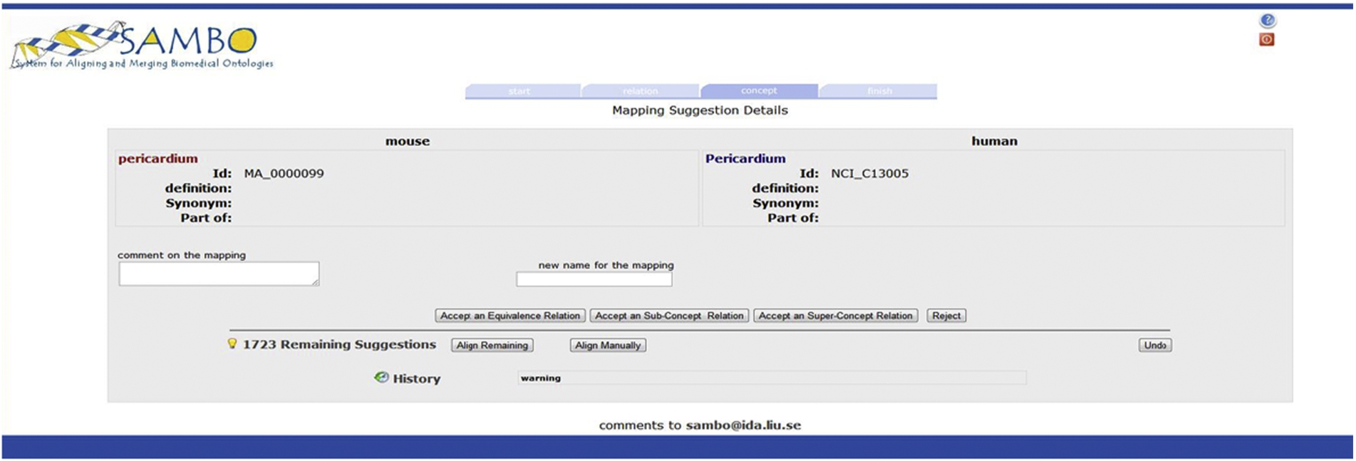 The validation sessions allow a domain expert to validate mapping suggestions. The mapping suggestions can come from a computation session (complete or partial results) or be the remaining part of the mapping suggestions of a previous validation session. For the validation we extended the user interface of SAMBO [32], which took into account lessons learned from experiments [24,25] with ontology engineering systems’ user interfaces. As stated in [12] our user interface evaluations are one of the few existing evaluations and our system is one of the few systems based on such evaluation. Through the interface, the system presents mapping suggestions (Fig. 7) with available information about the entities in the mapping suggestions. When an entity appears in multiple mapping suggestions, these will be shown at the same time. The user can accept a mapping suggestion as an ≡, ⊑ or ⊒ mapping, or reject the mapping suggestion by clicking the appropriate buttons. Further, the user can give a preferred name to equivalent entities as well as annotate the decisions. The user can also review the previous decisions (‘History’) as well as receive a summary of the mapping suggestions still to validate (‘Remaining Suggestions’). After validation a reasoner is used to detect conflicts in the decisions and the user is notified if any such occur.