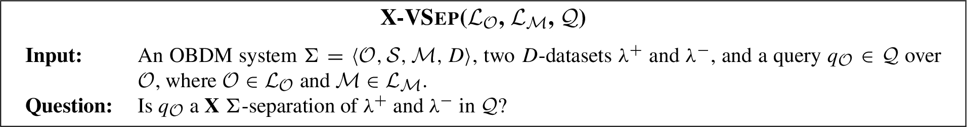 Outline of the paper The paper is organized as follows. After the discussion of related works in Section 2, Section 3 introduces the relevant background for our study and Section 4 illustrates a formal framework for separation in OBDM. Then, Sections 5, 6, and 7 present the results on the three computational problems Verification, Computation, and Existence, respectively. We deal first with the Computation problem and then with the Existence problem because the solutions we will provide about the Computation problem will help us to solve some tasks about the Existence problem. Finally, Section 8 concludes the paper with a perspective on future work.