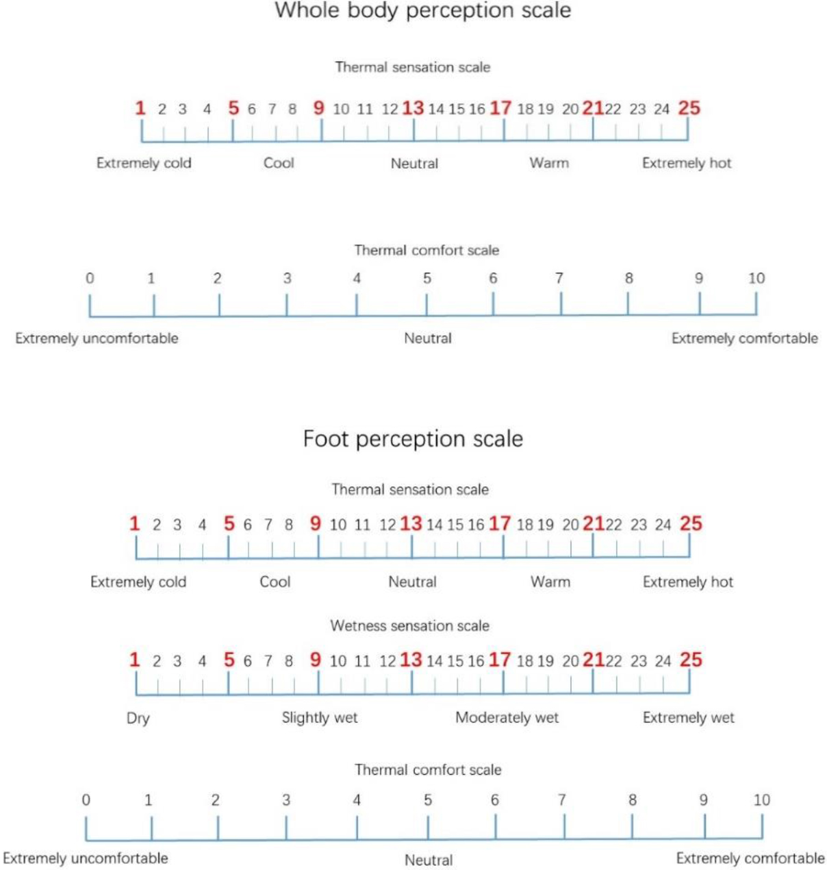 To evaluate thermal sensation, wetness perception, and thermal comfort, ordinal scales were employed. These scales were meticulously designed by guidelines outlined in ISO 10551 [18]. Considerable attention was given to selecting appropriate descriptors, ensuring sensitivity, accuracy, and ease of use for each scale. The implemented scales allowed for the collection of subjective information concerning thermal sensation, thermal comfort for the entire body, thermal sensation, wetness perception, and thermal comfort specifically for the foot.