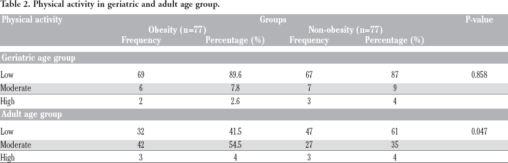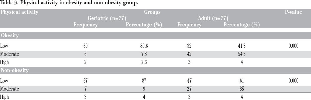 Table 3 shows the differences between physical activity levels in the adult and geriatric group, with significant differences in the obese and non-obese groups at P<0.05. Physical activity is a nonpharmacological treatment available to most people, and it plays an essential role in preventing various metabolic diseases in overweight and obese adults. 25 A clinically significant weight loss (≥ 5% of initial weight) has been identified as predictors of metabolic disorders such as metabolic syndrome, insulin resistance, type-2 diabetes mellitus (T2DM), dyslipidemia, hypertension, lung diseases, cardiovascular diseases, and inflammation.26-28