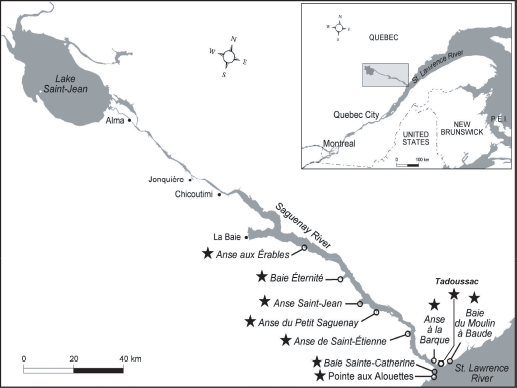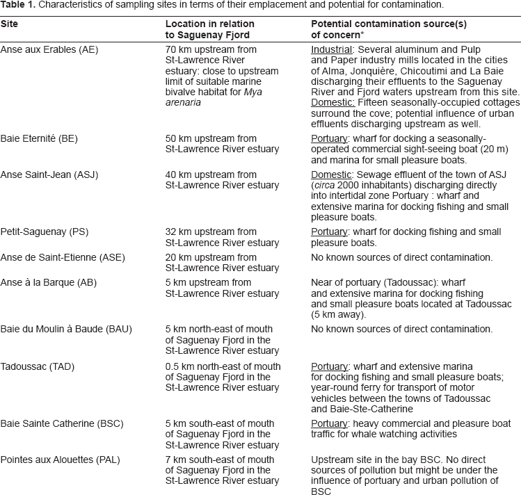 The Fjord du Saguenay sites included the Anse étienne (ASE) site, which was used as the reference site for the fjord, and was located on the south shore 20 km upstream from the fjord mouth. The Petit Saguenay (PS) site is located 32 km upstream on the south shore of the fjord mouth and has a small marina for seasonal activities and pleasure boating. The Anse Saint-Jean (ASJ) site is exposed to minimally treated (i.e. screened) urban wastewaters from a population of about 2,000 residents and is located 40 km upstream from the fjord mouth. The Baie éternité (BE) site is located 50 km upstream from the fjord mouth. It has a moderately sized marina under 10 m in length that accommodates circa 20 ships, and is used for recreational and tour boat activities. Finally, the Anse-aux-érables (AE) site, the site furthest upstream in the fjord (70 km upstream from the fjord mouth), is located downstream from aluminum smelters and pulp and paper mills, and from four towns that discharge their wastewaters into the fjord.