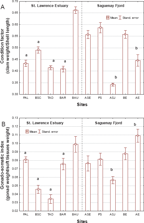 The morphological characteristics of clams collected in the Fjord du Saguenay and St. Lawrence estuary was examined (Fig. 2). In the St. Lawrence estuary, the weight-to-shell-length ratio (condition factor) was significantly reduced at sites subject to anthropogenic activity (Fig. 2A). A two-way ANOVA revealed that site location but not gender was a determining factor. Clams at the TAD and BAR sites were the most severely affected, with the weight-to-shell-length ratio decreasing 1.6 times. The ratios for clams in the Fjord du Saguenay at the ASJ and AE sites were generally less affected, decreasing by factors of 1.6 and 1.2 respectively. The gonado-somatic index (GSI) was also affected at the study sites with no apparent sex-related effects (Fig. 2B). In the St. Lawrence estuary, the GSI was reduced at all polluted sites, especially the BSC and TAD sites, with reductions by factors of 2.7 and 3 respectively, compared with the reference site (i.e. BAU). In the Fjord du Saguenay, GSI increased by a factor of 1.4 at the AE site and decreased by a factor of 1.9 at the ASJ site. Correlation analysis (Table 2) revealed that the weight-to-shell-length ratio was significantly correlated with GSI (r = 0.46; p < 0.01). Analysis of clam age distributions revealed that age status varied from 5 to 9 years of age and was significantly correlated with GSI (r = 0.46; p = 0.001).