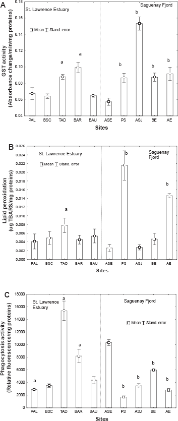 The physiological health status of the clams was also determined by tracking the extent of GST activity, and LPO and phagocytic activity (Figs. 3A to 3C). GST activity was readily induced at the polluted TAD and BAR sites in the St. Lawrence estuary (increasing by a factor of 1.4 at the BAR site), with no apparent gender-related interactions (two-way factorial ANOVA: p < 0.01 for site and p > 0.1 for gender) (Fig. 3A). In the Fjord du Saguenay, GST activity was readily induced at all impacted sites, increasing by a factor 2.7 at the site receiving municipal wastewater (i.e., site ASJ).