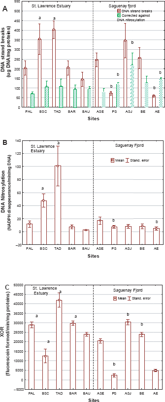 At the St. Lawrence estuary sites, the levels of DNA strand breaks, when corrected against DNA nitrosylation (i.e. the residuals) were not significantly different from those at the BAU reference site, suggesting that DNA damage seems the result of an immunological response rather than through pollution effects in the gonad. The occurrence of red algal tides, which occurs in the estuary but not in the Fjord du Saguenay, could stimulate phagocytosis and lead to increased DNA damage. Clearly, more research will be needed to determine whether algal blooms can stimulate the immune systems in bivalves and contribute to DNA nitrosylation.