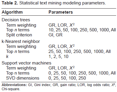 The weight and structural features described above were calculated for all sentences using distinct terms (after removing stop words). Three different machine learning algorithms were used: Decision Trees (DT), Logistic Regression (LR), and Support Vector Machines (SVM). Table 4 summarizes the parameters used with each algorithm. Greater detail of the process and parameters used are given in the list below.