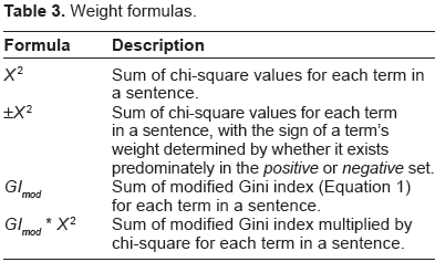 Table 4 summarizes the four formulas used to calculate weights along with a short description of their calculation. The formulas were used to create sets of features for input into data mining models–-ie, for each formula used, a feature would be created for each label. The set notation {} (used in Table 4 below) represents which groups of formulas were used to create features. For instance, {