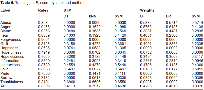 After the entire process, over 4,000 phrases/rules were retained (more than one rule may exist per sentence). Table 1 shows the breakdown of rules by label.