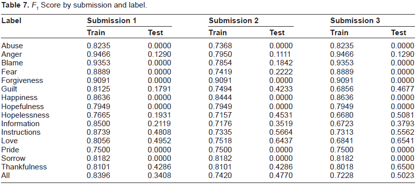 For the competition, each sentence was reviewed by three annotators and assigned zero to many labels representing emotions/concepts (eg, ABUSE, INFORMATION, LOVE). The sentence-level inter-annotator agreement for the training and test dataset was 0.546. In both datasets, roughly half the sentences were assigned a label, with relatively few of those having multiple labels.