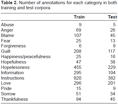 Number of annotations for each category in both training and test corpora.