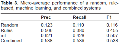 Micro-average performance of a random, rule-based, machine learning, and combined systems.