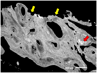 BSE micrograph from Patient 2's HO. The bone resorption (yellow arrows) at the outer boundaries and bone fragment (red arrow) within the ectopic bone are to be noted.