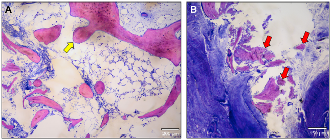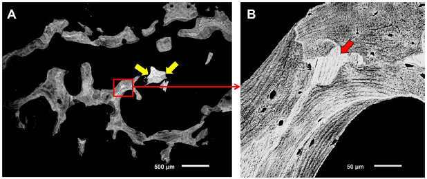 BSE micrograph from Patient 3 showing a trabecular-like bone structure of HO: (A) the unincorporated bone chip (yellow arrows) and (B) bone chip (red arrow) that has been incorporated by new bone growth.