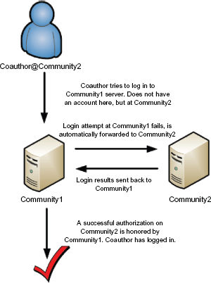 Login authentication forwarding. The coauthor of a paper is able to log in to the author's community site if it is configured to honor authorizations from the coauthor's own community.