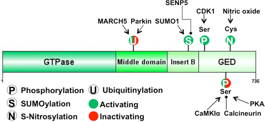 Additionally, Drp1 activity can be tightly regulated by a series of PTMs including S-nitrosylation, phosphorylation, SUMOylation and ubiquitination, as depicted in Figure 2. These PTMs generally do not target the Drp1 GTPase domain but instead are located within or in close proximity to the GED domain, thereby allosterically influencing GTPase activity. 22