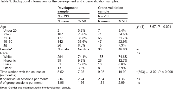 A multi-step approach was adopted to evaluate the construct validity for the client level CBT and MET adherence scales. First, we determined that there were no significant differences between the background information for clients in Wave 1 and Wave 2, and the total scale score did not change. Therefore, to increase the sample size for the exploratory factor analyses (EFA), we combined these two waves of data. Table 1 shows the background information by sample groups. EFA was then employed to evaluate the factor structure using the combined Wave 1 and Wave 2 data (now termed the development sample). The factor solutions from the EFA were verified through Confirmatory Factor Analyses (CFA) using the Wave 3 data (the cross-validation sample).