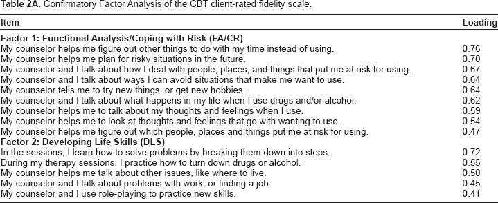 For CBT, the initial factor analysis yielded a three-factor solution; however, three items had unclear factor loadings. For example, one item did not load onto any factor, and two items had high factor loadings for more than one factor, which implied that the factors were not distinct for these items. As suggested by Kahn, 24 these items were removed to obtain a clearer factor solution. The factor analysis was re-run to reveal a two-factor solution. The first factor accounted for 55.25% of the total variance, and the second factor added an additional 7.91% variance. Items that loaded onto the first factor reflected the combined concept of “Functional Analysis/Coping with Risk” (eg, “My counselor helps me figure out other things to do with my time instead of using”), and items loading onto the second factor represented the “Developing Life Skills” domain (eg, “In my sessions, I learn how to solve problems by breaking them down into steps”).