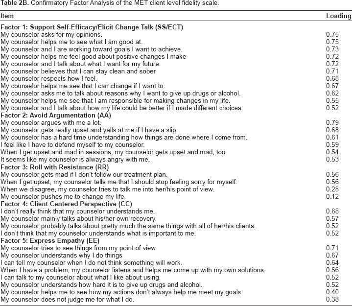 The EFA for the MET scale revealed a potential five factor solution. The five-factor solution accounted for 56.29% of the variance, and reflected the following five domains: “Support Self-Efficacy/Elicit Change Talk” (eg, “My counselor and I talk about what I want for my future”); “Avoid Argumentation” (eg, “I feel like I have to defend myself to my counselor [reverse scored]); “Roll with Resistance” (eg, “My counselor gets mad if I don't follow our treatment plan” [reverse scored]); “Client Centered Perspective” (eg, “I don't really think that my counselor understands me”[reverse scored]); and “Express Empathy/ Acceptance” (eg, “My counselor tries to see things from my point of view”).