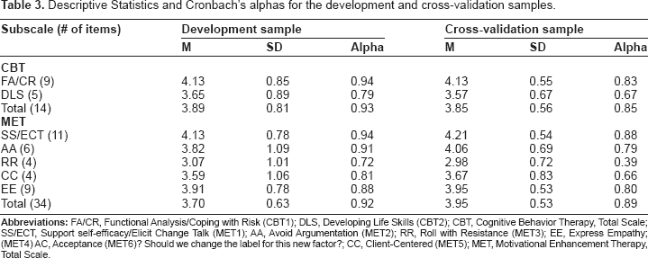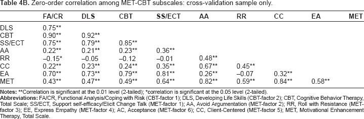 Means and standard deviations for the final CBT and MET subscales are presented in Table 3. Tables 4A and B show the inter-correlations among the CBT and MET subscales, as well as the total scores for the development and cross-validation samples.