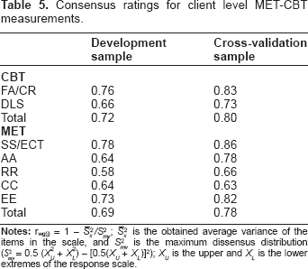 We examined the level of consensus, or rwg(j), among clients rating the same counselor on the counselor's MET-CBT skills. For most of the CBT and MET subscales and total scores, the rwg(j) was higher than the acceptable 0.70, except for the Rolling with Resistance and Client Centered subscales. We hypothesize that these two subscales were lower because they tap counselor skills that are more difficult for clients to recognize. Even though the RR and CC subscales had lower consensus scores, they still were in the 0.6 range, which implies a moderate degree of agreement among clients’ ratings of the same counselor.