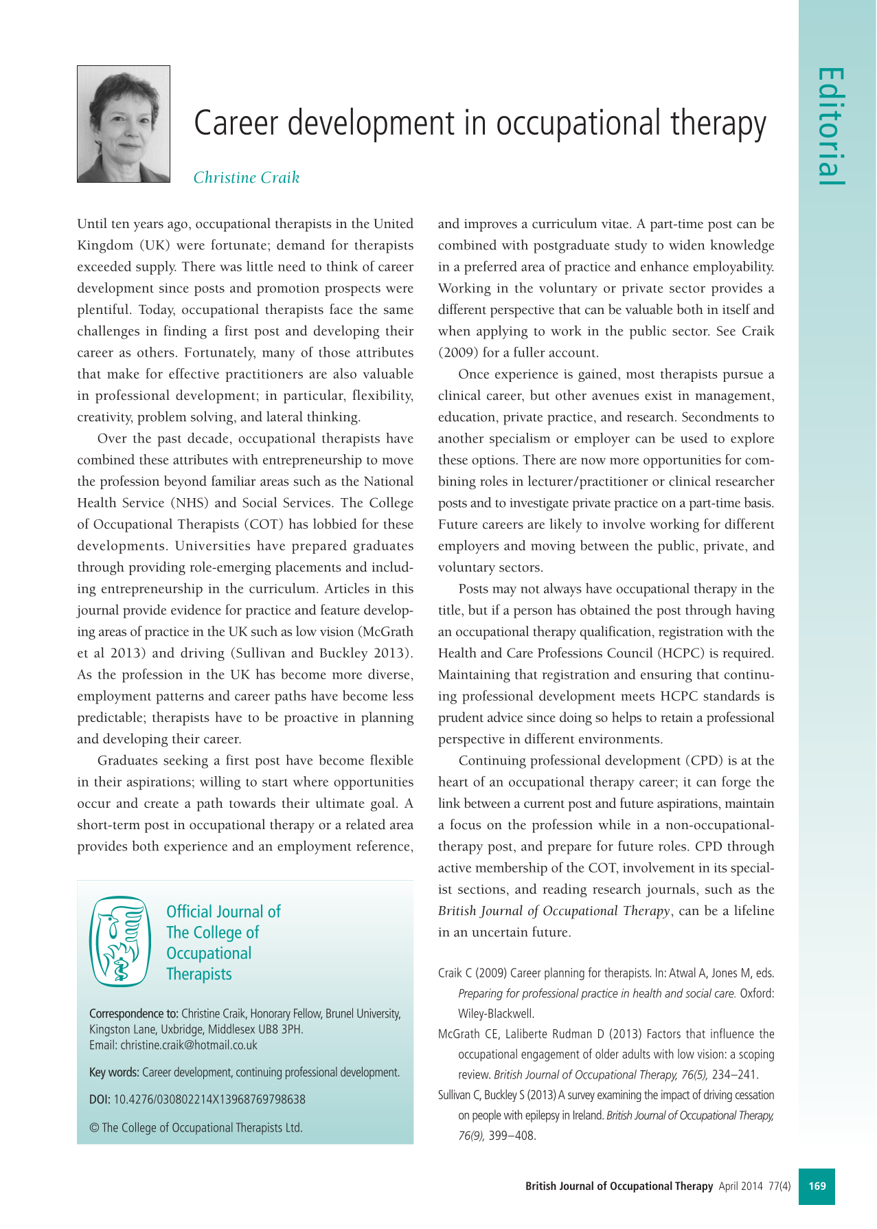 CraikC (2009) Career planning for therapists. In: AtwalAJonesM, eds. Preparing for professional practice in health and social care. Oxford: Wiley-Blackwell.